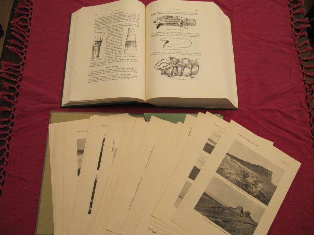 | Uhle, Max. Kultur und Industrie südamerikanischer Völker. Nach den im Besitze des Museums für Völkerkunde zu Leipzig befindlichen Sammlungen von A.Stübel, W. Reiss und B.Koppel. 2 Bände. Erster Band: Alte Zeit, 1889. / Zweiter Band: Neue Zeit, 1890. Berlin, Verlag von A. Asher & Co., 1889 / 1890. EA. Bd. I mit 28 Tafeln auf starkem Karton, davon 21 Chromo-Lithographien sowie 7 s/w Lichtdrucke. / Bd.II mit 27 Tafeln auf starkem Karton, davon 14 Chromo-Lithographien sowie 13 s/w Lichtdrucke. Bd. I mit 2 Blatt (Vortitel + Titel), 2 Blatt (Vorwort von A. Stübel + Tafelverzeichnis) plus zusammen 118 S. Beschreibungen der Tafeln, jeweils unpaginiert den Tafeln vorliegend mit 1, 2 oder 3 Blatt. / Bd.II mit 2 Blatt (Vortitel + Titel; ! Diese beiden Blätter als einzige des 2bändigen Werkes nicht im Original, sondern in Kopie in gleicher Größe vorliegend!), I-IV (Verzeichnis der Tafeln und der Fundorte), Seiten 1-10 (Kurzbeschreibung der Tafeln) plus zusammen 92 S. Beschreibungen der Tafeln, jeweils unpaginiert den Tafeln vorliegend mit 1, 2 oder 3 Blatt. Folio 53 x 39 cm. Original Halbleder-Portfoliomappen mit losen Blättern bzw. Doppelblättern sowie Tafeln, beide mit Schließbändchen. Bd. I mit restaurierten, teils neuen Klappen und neuem Schließbändchen, Umschläge teils fleckig . Auf dem vorderen Umschläg sind drei handschriftliche Buchstaben, (D - W - K , vermutl. 'David Wolcott Kendall, dessen Exlibri auf dem Vorsatz). Die ersten beiden Blätter mit stärkeren Gebrauchsspuren bzw. kleinen Randeinrissen; ansonsten der gesamte erste Band in selten gutem Zustand, sauber und vollständig. / Bd. II mit neuem Vorderdeckel ( nach Scan eines anderen Exemplars) und neuen Klappen und neuem Schließbändchen; hier im 2. Band sind zahlreiche Seiten mit sehr brüchigem Papier, mit Einrissen und Fehlstellen; davon ist jedoch weder der Text der Textseiten noch sind die Chromolithographien oder Lichtdrucke betroffen, alle Seiten sind vollständig und sauber. Zwei Textseiten mit Prägestempel sowie alle Tafeln mit einem kleinen, blauen Bibl.-Stempel ( Brooklyn Library). Die beiden schweren Bände ( 10kg.!) äußerst selten so fast vollständig in den Portfolio-Mappen, nicht eine Nennung im JAP (!), nur in wenigen Bibliotheken weltweit sind vollständige Exemplare im Original (statt elektronische Reproduktionen) vorhanden. Die extrem aufwändige Herstellung der chromolithographischen Tafeln dauerte 7 Jahre. Dem Anspruch der größtmöglichen Naturtreue wurde - laut Vorwort - 'mit Meisterschaft genügt'. Die wunderbaren Tafeln haben bis heute eine faszinierende Strahlkraft. - - Uhle war sicher mit einer der bedeutendsten Altamerikanisten seiner Zeit und DER Experte für die Beschreibung der Sammlung von Stübel und Reiss. Bestellnummer: kai1872 Preis: 2100 EUR Versandkonditionen |