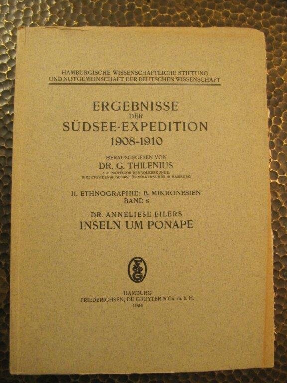 Hambruch, Dr. Paul / Eilers, Dr. Anneliese. Ponape. 2. Teilband. Hamburg, De Gruyter & Co., 1936. EA. Mit einer farbigen und 9 s/w-Tafeln mit fotogr. Abb. sowie weiteren 176 Abb. im Text (Zeichnungen). XVI, 1Bl., 386 S. Gr.-4°. Ergebnisse der Südsee-Expedition 1908-1910. II. Ethnographie: B. Mikronesien. Band 7. Obr., teils unaufgeschnitten. Tadelloser Zustand, sauber, vollständig, kein Bibl.-Expl. Selten, mit ausgezeichnetem Abb.-Material. Bestellnummer: kai1604 Preis: 190 EUR Versandkonditionen |