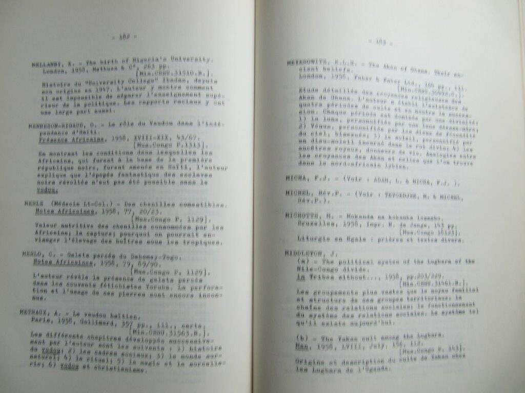 Boone, Olga. Bibliographie Ethnographique du Congo Belge et des Regions Avoisinantes. 1958. Tervuren, Musee Royal de L'Afrique Centrale, 1960. EA. 3 Bl., 358 S. Gr. 8°. OBr. Umschlag etwas fleckig, sonst sehr gut. Der seltene Band über 1958. Bestellnummer: kai2215 Preis: 50 EUR Versandkonditionen |