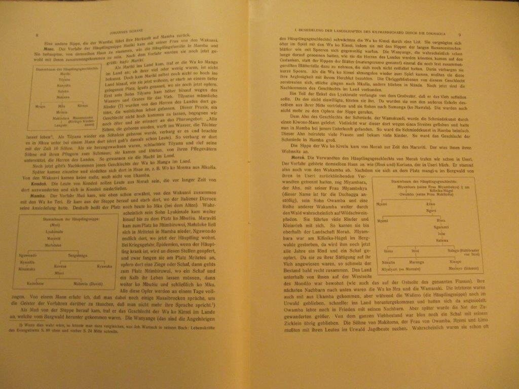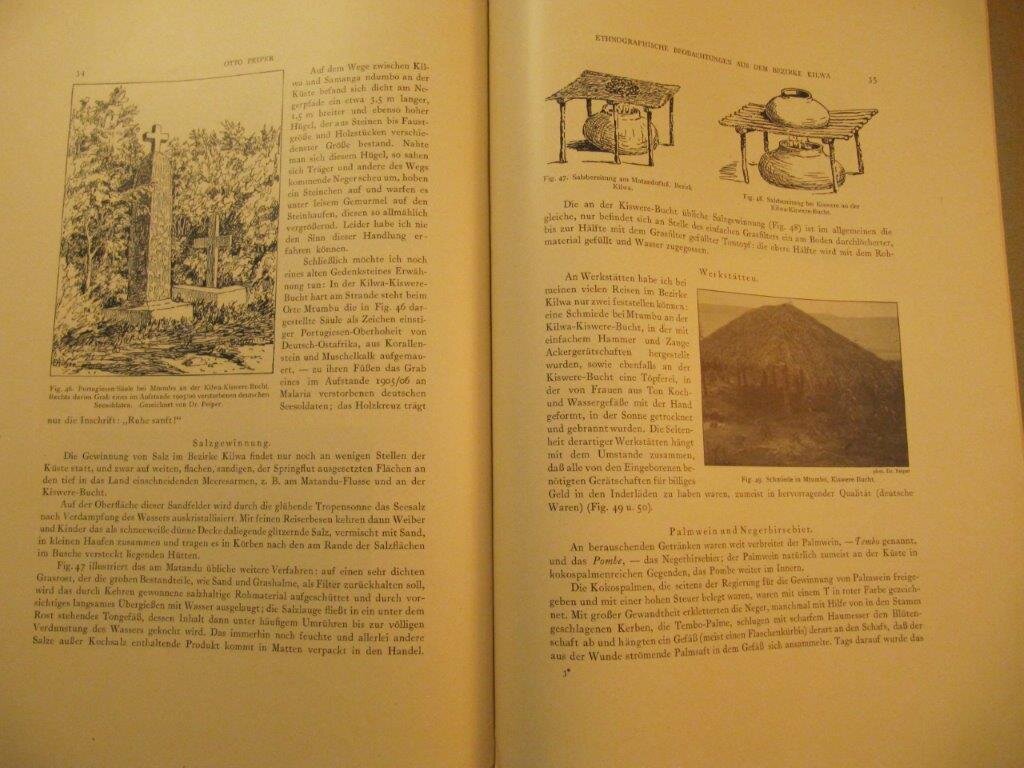 Werther, C. Waldemar. Die mittleren Hochländer des nördlichen Deutsch-Ost-Afrika. Wissenschaftliche Ergebnisse der Irangi-Expedition 1896-1897 nebst kurzer Reisebeschreibung. Berlin, Verlag H. Paetel, 1898. EA. Mit 5 Vollbildern (= Tafeln mit fotogr. Abb. bzw. Zeichnungen) und 126 Text-Illustrationen in Photogravüre, Lichtdruck, Lithographie und Autotypie sowie 2 großen, mehrfach gefalteten Farbkarten ( 52x42cm / 75x55cm). 493 S., 2 Bl. 4°. GLn.-Band mit Rücken-Goldprägung Bibl.-Expl. mit lediglich einem Stempel auf dem Titelblatt und einem weiteren auf Seite 65 unten, keine weiteren Bibl.-Merkmale und auch keinerlei Gebrauchsspuren, lediglich einige eher winzige Einrisse des sehr brüchigen Papier im Vortitel und auf den letzten zwei Seiten. Ansonsten Tadelloser Zustand des neu eingebundenen Werkes. Aus heutiger Dekolonialisierungs-Sicht schon des öfteren sehr harter Tobak - -gepaart mit einer enormen Fülle detaillierter wissenschaftlicher Beobachtungen. Bestellnummer: kai1610 Preis: 40 EUR Versandkonditionen |