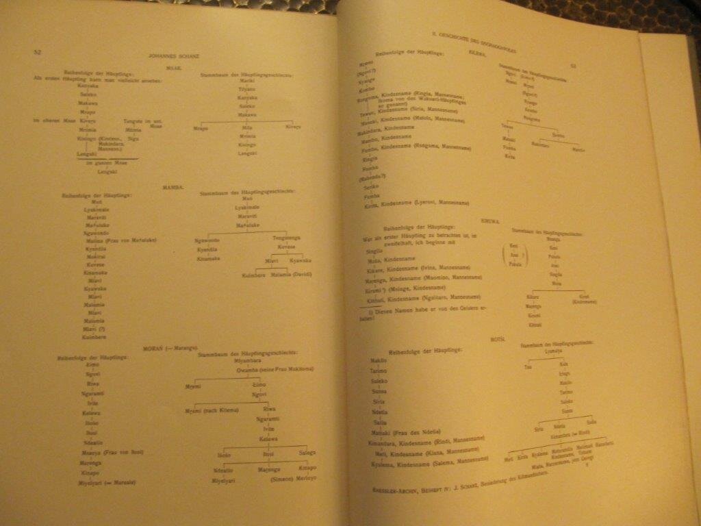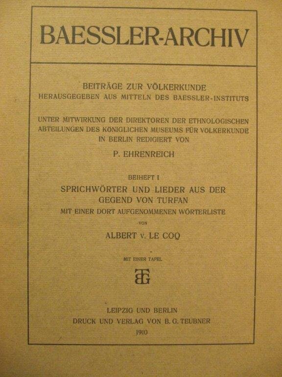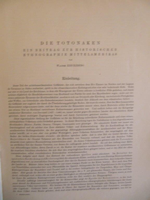 Thorbecke, Franz und Marie Pauline. Im Hochland von Mittel-Kamerun. 4 Bände (in 5 Teilen= 1./2./3. und 4.erste und zweite Hälfte) . Hamburg, Friederichsen / Cram, deGruyter, 1914/ 1916/ 1919/ 1924/ 1951. EA. Mit zusammen 111 Tafeln, 4 Farbtafeln,5 gefalteten Karten, 77 Textabbildungen und 10 Tafel mit Musikbeispielen. Band 1: Die Reise: Eindrücke und Beobachtungen. Mit 75 Abbildungen auf 50 Tafeln, 1 Farbtafel und 1 Karte. XII/101 Seiten.- Band 2: Anthropogeographie des Ost-Mbamlandes. Mit 37 Abbildungen auf 26 Tafeln und 2 Karten. X/94 Seiten. - Band 3: Beiträge zur Völkerkunde des Ost-Mbamlandes. Mit 3 Farbentafeln, 141 Abbildungen auf 35 Tafeln, 32 Textfiguren, 2 Tabellen, 23 Transkriptionen und 1 Tafel Tonleitern. XII, 178, 20 Seiten.- Band 4/1: Die Karte des Ost-Mbamlandes nach den Aufnahmen der Expedition.16 Seiten Text und große Faltkarte. - Band 4/2: Physische Geographie des Ost-Mbamlandes. Mit 45 Abbildungen im Text und einer Karte mit geologischen Signaturen. X/294 Seiten. 4°. 1. , 2. und 3. Teil: Abhandlungen des Hamburgischen Kolonialinstituts, Bde. XXI, XXXVI u. XXXXI. (Reihe C. Geographie, Geologie, Mineralogie und Paläontologie, Bde. 1,5 u. 7.). 4.Teil, 1. Hälfte ohne Zuordnung. 4.Teil, 2. Hälfte: Universität Hamburg, Abhandlungen aus dem Gebiet der Auslandskunde. Band 55 - Reihe C. Naturwissenschaften Band 15 . Alle 4 umfangreichen Text- Teilbände unbeschnittene Original-Broschurbände; nur der dünne Kartenband (4.Teil, 1.Hälfte) ist beschnitten. Nur der dünne Kartenband mit Gebrauchsspuren, 2 kleinen Stempeln sowie einer Widmung von Franz Thorbecke. Die 4 Hauptbände in hervorragendem, frischem Zustand, keine Bibl.-Exemplare. Sehr selten vollständig angeboten. Vor allem der meist fehlende zweite Teil des vierten Bandes, der von Thorbeckes Frau herausgegeben wurde, ist hier mit vorhanden. Eine Rarität in ausgezeichnetem Zustand! Bestellnummer: kai1739 Preis: 440 EUR Versandkonditionen |