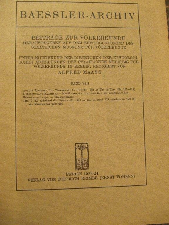 .' sind von 1911 bis 1928 zahlreiche (35) überwiegend ausgezeichnet recherchierte Ausgaben erschienen, oft mit ethnologisch/anthropologischem Schwerpunkt. Dieses Werk über die wenig beschriebenen Schouten- und Padaido-Inseln (im Norden der Geelvinkbaai, heute Cenderawasih-Bucht genannt, nordwestl. Westneuguinea, heutiges Indonesien) , basiert auf Unterlagen und Notizen von W.K.H.Feuilletau de Bruyn (auch Bruijn) und bezieht sich zum großen Teil auf die 'Biakkers', wie die Ureinwohner der Schouten-Insel Biak von den Holländern genannt wurden. Sehr selten. Bestellnummer: kai1201 Preis: 195 EUR Versandkonditionen |