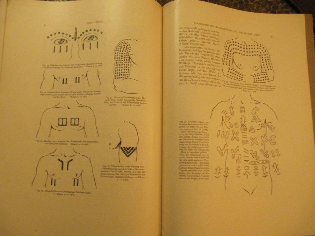 Weiß ( Weiss ), Max. Die Völkerstämme im Norden Deutsch-Ostafrikas. Berlin, Marschner, 1910. EA. Mit 21 Tafeln, 2 Karten, davon eine mehrfach gefaltet, und 358 Textabbildungen ( Fotografien). XX, 455S. Gr. 8°. HLn.-Band d.Z. mit Rückenschildchen und marmorierten Deckeln, mit Fadenheftung, ohne Klammern. Vorsätze und Faltkarte minimal fleckig, an 3-4 Stellen ist der Buchblock leicht angebrochen, hält aber zuverlässig. Der gesamte Innenteil ist sauber und vollständig, der Einband sehr gut. Das sehr seltene, schwere Foto-Werk von Max Weiss komplett auf Kunstdruckpapier. Sehr, sehr viele Fotos von wenig bis gar nicht bekleideten Menschen. Die allermeisten schauen unglücklich, genervt, gestresst in die Kamera, die für die Aufnahmen (unter Druck ?) abgestreifte Kleidung zu ihren Füssen. Zahlreiche Aufnahmen frontal, von der Seite und von hinten wollen wohl den pseudo-wissenschaftlichen Eindruck der anthropometrischen Fotografie imitieren; so wird auch munter drauflos geschwafelt, wer wohl wann mit wem sich mischte, es ist halt die Blütezeit der Rassenkunde. Heute, vor dem Hintergrund intensiver Dekolonisierungs-Debatten u.a. mit den Enkeln und Urenkeln der so würdelos Fotografierten muss sich die Frage stellen, ob diese Fotografien überhaupt noch unkommentiert gezeigt werden dürfen/sollten. Sind sie nicht wie unzählige Masken, Schädel und Gerätschaften ebenfalls 'geraubt' worden? Bestellnummer: kai1499 Preis: 160 EUR Versandkonditionen |