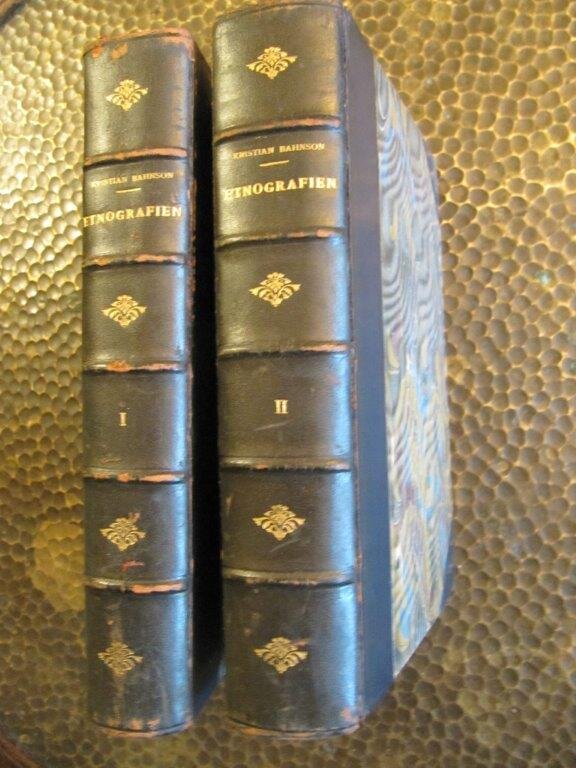 Bahnson, Kristian. Etnografien. 2 Bände. Kopenhagen, Det Nordiske Forlag, 1900. EA. Mit einer enormen Vielzahl von Fotografien und Zeichnungen im Text und auf Tafeln, in Farbe und s/w. Weiterhin etliche Farbkarten, teils gefaltet, teils mehrfach gefaltet. LXV, (2), 548 S. / XI, (1), 704 S. Gr. 8°. OHLdr.-Bände mit Rücken-Goldprägung und marmorierten Deckeln. Die Aussengelenke sind teils etwas angebrochen, die Ecken leicht bestoßen; minimal stockfleckig im Schnitt, aber ansonsten sehr gut, sauber und vollständig. Bestellnummer: kai2248 Preis: 40 EUR Versandkonditionen |