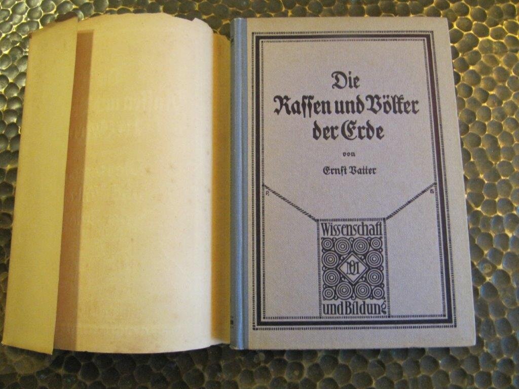 Vatter, Ernst. Die Rassen und Völker der Erde. Leipzig, Verlag von Quelle und Meyer, 1927. EA. Mit 14 Tafeln mit zahlreichen fotograf. Abbildungen sowie etlichen Zeichnungen und Karten. 2 Bl., unpag. Tafelteil, 133 S. 8°. OHLn.-Bändchen. OU. OU minimal fleckig, ganz wenig eingerissen auf der Rückseite oben.Im Innenteil einige Anstreichungen mit Blei- oder Blaustift, ansonsten sehr gut, sauber, vollständig. Es ist tatsächlich schwer erträglich, sich mit dieser Art von 'Rassenkunde' heute noch zu beschäftigen. Selten. Bestellnummer: kai2249 Preis: 35 EUR Versandkonditionen |