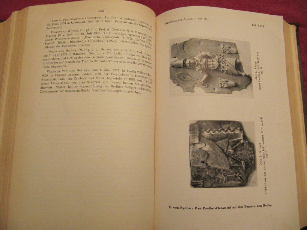 | Nieuwenhuis / Boas / Juynbull / von Nordenskiöld etc… (Hrsg.) Internationales Archiv für Ethnographie. 13 Jahrgänge in 10 Bänden. Leiden, Brill, 1927 - 1942. EA. Mit einer enormen Fülle an Tafeln mit Fotografien und Zeichnungen, in Farbe und s/w; mit ebenfalls sehr zahlreichen - teils mehrfach gefalteten - Karten, Plänen, Schemata und Tabellen; und natürlich schließlich hunderte von Fotografien und Zeichnungen im Text. Ca. 5100 - 5200 Seiten zusammen. Folio-Format 33x26cm. Alle Bände in einheitlichen grünen GLn.-Einbänden mit Rücken-Goldprägung. Alle 13 Bände in gutem bis sehr gutem Zustand, vollständig, fest in der Bindung, fast ohne Gebrauchsspuren. Mit jeweils lediglich einem kleinen ExLibris auf dem Vorsatz und einem Prägestempel auf der Titelseite (Carnegie Library Pittsburgh). Zweifellos eine der wichtigsten ethnologisch-ethnographischen Zeitschriften Europas, aus Leiden, einem der Knotenpunkte dieses Fachbereiches für viele Jahrzehnte. Eine Serie von 13 vollständigen (inkl. aller Supplemente!!) Bänden, fast jeder davon einzeln sehr selten angeboten. Fast alle namhaften Ethnologen der ersten Hälfte des 20ten Jhd haben für das 'Archiv' geschreiben; hier in diesen Bänden u.a. Augustin Krämer, Geza Roheim, P.W.Schmidt, Walter Hirschberg, Wilhelm Mühlmann (Ariori!), Jaap Kunst, Kleiweg de Zwaan, Felix Speiser, Vroklage etc.....Mit allen Supplementen wie z.B. von Paul Wirz über Reisbau-Kulte auf Bali und Lombok, von Nieuwenhuis über Sexualtotemismus, von van Gulik ( Hayagriva) oder der sehr umfangreiche Beitrag von Kleiweg de Zwaan über anthropologische Untersuchungen auf Bali und Lombok (allein über 300 S. ). Zusammen fast 30 kg Ethnologie, Anthropologie und Archäologie. Bestellnummer: kai1748 Preis: 980 EUR Versandkonditionen |