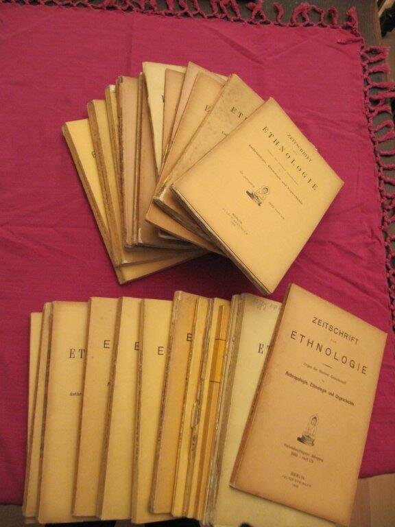 | Berliner Gesellschaft für Anthropologie, Ethnologie und Urgeschichte (Hrsg.). Zeitschrift für Ethnologie. Konvolut von 28 Einzelheften. Berlin, Asher / Behrend / Springer. 1885 - 1942. EA. Mit sehr zahlreichen Fotografien, Zeichnungen, teils mehrf. gef. Karten und diversen Beilagen. Gr. 8°. O-Broschur. Überwiegend guter bis sehr guter Zustand, aber einige wenige Hefte mit Einrissen, Fehlstellen, Stempeln oder teils welligen Seiten. Ca. 10kg Ethnologie, überwiegend Jahrgänge der 20er und 30er Jahre des letzten Jahrhunderts. Verteten die gesamte 'Creme' der Ethnologie und Anthropologie, teils mit über 100-seitigen Beiträgen. Z.B.: Lagerkrantz, Trimborn, Thurnwald, Preuß, Tessmann, Felix Speiser, Martin Gusinde, Fürer-Haimendorf, K.v. d. Steinen, Lehmann-Nitsche , Fritz Sarasin,Virchow, Franz Boas, v. Luschan, Koch-Grünberg, Nevermann oder Augustin Krämer. Bestellnummer: kai2264 Preis: 140 EUR Versandkonditionen |