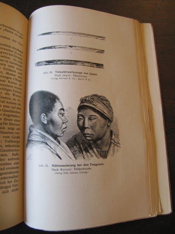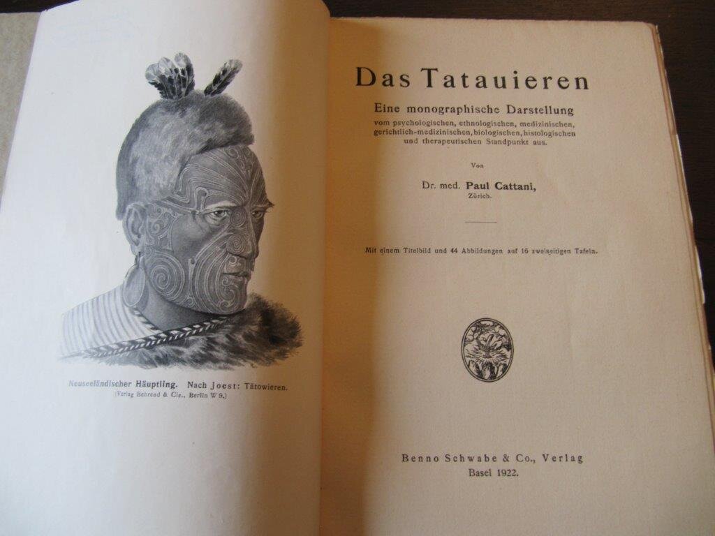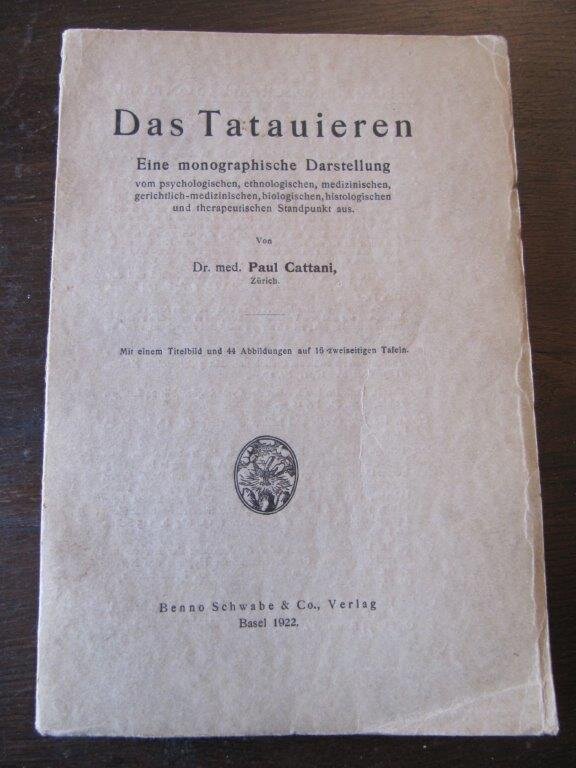 | Cattani, Dr. med. Paul. Das Tatauieren. Eine monographische Darstellung vom psychologischen, ethnologischen, medizinischen, gerichtlich-medizinischen, biologischen, histologischen und therapeutischen Standpunkt aus. Basel, Benno Schwabe & Co., Verlag, 1922. EA. Mit einem Titelbild (Frontispiez) sowie weiteren 44 Abbildungen (überwiegend Fotografien) auf 16 zweiseitigen Tafeln. 88 S. Gr. 8°. Obr. Broschurumschlag mit moderaten Gebrauchsspuren; auf der Rückseite des Frontispiz ein mit Tippex übermalter handschr. Eintrag. Ansonsten sehr gut, sauber und vollständig. Bestellnummer: kai2339 Preis: 80 EUR Versandkonditionen |