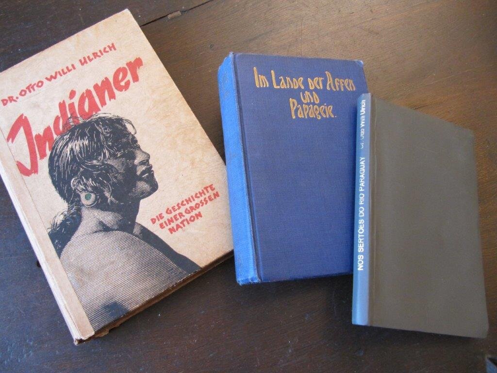 | Ulrich, Dr. Otto Willi. 1):Im Lande der Affen und Papageie (sic!). Reiseerinnerungen an Sued-Amerika, Brasilien, Paraguay und Argentinien, mit vielen Photographischen Aufnahmen und einer Karte von Sued-Amerika. / 2): Nos Sertoes do Rio Paraguay. Impressoes de Viagem da Expedicao Ulrich ao "Hinterland" Brasileiro-Boliviano. / 3): Indianer.Die Geschichte einer großen Nation. N.Y. / Sao Paolo./ Rio de Janeiro. Geogr. Publishing Co. / J. Fagundes. / Casa Editora de Obras Scientificas Ltda. 1930./ 1937./ 1938. EA. Mit zusammen ca. 200 fotogr.Abb. auf Tafeln sowie sehr zahlreichen Zeichnungen und Karten. 262 S. / 111 S. / 218 S. + umfangreicher Tafelteil. 8°., 8°, Gr. 8°. OGLn.-Band mit Rücken- und Deckel-Goldprägung. / Neuerer PpBd. mit Rücken-Goldprägung und eingeb. OBroschur. / Illustr. OPpBd. Im Lande….' mit leicht bestoßenen Deckeln und sehr gering ausgefransten Kapitalen,ansonsen sehrt gut. / 'Nos Sertoes……' neu eingebunden mit neuen Vorsätzen. Die ersten und letzten Seiten teils etwas fleckig oder feuchtigkeitsrandig; Ein Kommentar mit Bleistift auf Seite 47 - ansonsten gut. / 'Indianer.....' mit stabilisiertem Rücken sowie hier und da etwas stockfleckig; vollständig und fest in der Bindung.- - -Alle drei Bücher vollständig in ordentlichem Zustand. Wer war Dr. Otto Willi Ulrich? Mit diesen drei Büchern liegt alles von diesem deutsch-brasilianischem Abenteurer Veröffentlichte vor. Im ersterschienenen 'Im Lande der Affen und Papageie' wird reichlich gesoffen und es wird auch mal ungerührt eine 'Bande' von über 40 Indianern mit Frauen und Kindern unter munterer Beteiligung des Autors ausgelöscht (S. 59). Das extrem seltene ' Nos Sertoes do Rio Paraguay' berichtet von der 'Ulrich-Expedition' , die immerhin 25.000 km durch weite Teile Brasiliens (Amazonas, Matto Grosso, Minas Gerais, Bahia, Pernambuco etc....) sowie Boliviens und Paraguays führte, andererseits aber mit keinem Sterbenswörtchen in irgendeiner dem Antiquar bekannten wissenschaftl. Publikation je erwähnt wurde. Das dritte Werk, 'Indianer. Die Geschichte einer großen Nation' , überrascht dann mit einem überwiegend historisch-ethnologisch orientiertem und durchaus detailreichem Überblick über viele Indianervölker Nord-und Südamerikas; mittendrin ein guter und umfangreicher Bilder- und Kartenteil, der sich ausschließlich aus der 'Ulrich-Expedition' speist, jedoch in keinerlei Bezug zum Textteil steht. Das Vorwort offenbart dann eine - für die Zeit, 1938, - wohl noch sehr typische Art von verdächtiger Indianer- Romantik: "Hat die christliche Eroberung Amerikas überhaupt noch Menschen jener stolzen, wenn auch primitiven Rasse übrig gelassen? ..... Das freiheitsliebende deutsche Volk hat immer Sympathien für die Indianer gehegt". Alles in Allem bleibt verstärkt die Frage: Wer war dieser Dr. Ulrich? Nach wie vor dankbar für (weitere) Hinweise: Der Antiquar. ACHTUNG: Es handelt sich hier nicht um ein 3bändiges Werk, sondern um 3 unabhängig voneinander erschienene Bücher, wahrscheinlich alles, was es von diesem Autor gibt. Bestellnummer: kai2311 Preis: 290 EUR Versandkonditionen |