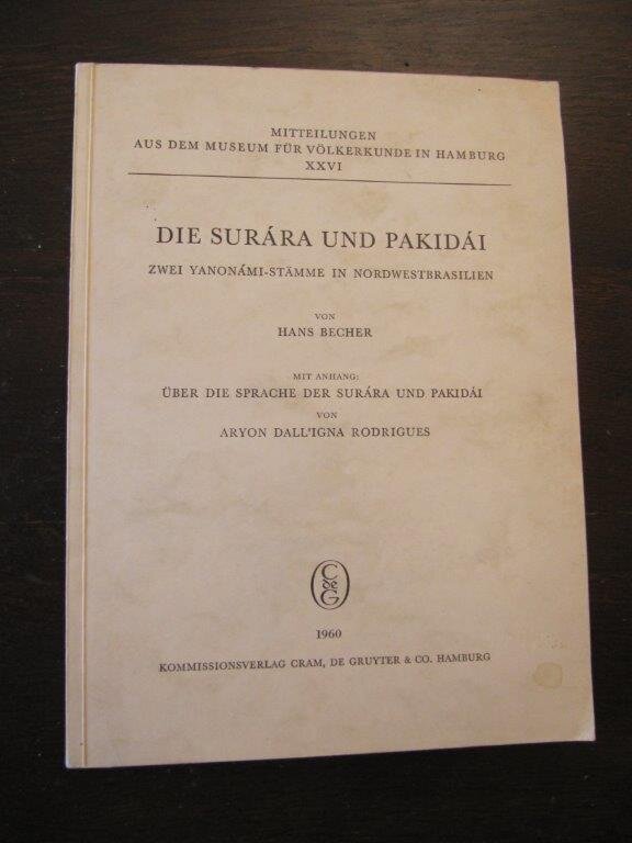 | Becher,Hans. Die Surara und Pakidai. Zwei Yanomami-Stämme in Nordwestbrasilien. Mit Anhang: Über die Sprache der Surara und Pakidai, von Aryon Dall'igna Rodrigues. Hamburg, de Gruyter, 1960. EA. Mit 50 fotogr. Abb. auf Tafeln, einer ganzseitigen Karte sowie 29 Zeichnungen im Text. VII, 138 S. /16 S. Tafelanhang. 4°. Mitteilungen aus dem Museum für Völkerkunde in Hamburg, XXVI. OKart. Minimale Gebrauchsspuren, fast neuwertig. Seltenes Werk über die Yanomami. Bestellnummer: kai2325 Preis: 90 EUR Versandkonditionen |