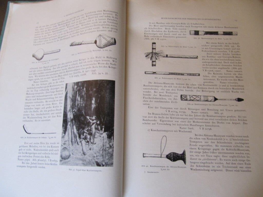 | Koch-Grünberg, Theodor. Vom Roroima zum Orinoco. Ergebnisse einer Reise in Nordbrasilien und Venezuela in den Jahren 1911-1913. 5 Bände. Berlin/Stuttgart, Reimer/Strecker&Schröder, 1917-1928. EA. Mit zus. 258 Tafeln mit (fast ausschließlich) fotogr. Abb. in Lichtdruck, weitere 109 fotogr. Abb. auf Tafeln in Lichtdruck und 16 Textabb., 4 teils mehrfach gefaltete Karten und einige Notenbeispiele. Zus. ca. 1.730 S. 4°. Bd.I und II illustr. OPpBd., Bde. III illustr. OGLn.-Bände, Bd. IV OhLn.-Band, Bd. V illustr. OHLn.-Band; Bde. I, II, III und V mit Rundum-Farbschnitt, Bd. IV mit Kopf-Farbschnitt. Alle 5 Bände in selten gutem, zum großen Teil neuwertigem Zustand, völlig sauber, keine Bibl.-Exemplare, vollständig und fest in der Bindung. Dem Band V liegen zudem etliche postkartengroße Foto-Portraitkarten auf starkem Karton bei, teils auf der Rückseite beschriftet mit 'Tukano', 'Uanana', 'Pira-Tapuyo' und 'Kobeua-PapuliHäHänaua'. Dieser ethnolog. Klassiker wird äußerst selten komplett in der Erstausgabe angeboten (meist ist Bd. II in der 2. Auflage von Strecker & Schröder), Gründe dafür sind sicher der lange Erscheinungszeitraum von 11 Jahren und der Verlagswechsel von Reimer (Bd. I und II) zu Strecker und Schröder (Bd. III bis V.). Die Fotografien von Koch-Grünberg sind wertvolle ethnologische Dokumente. Die Inhalte der 5 Bände:Bd.I.:Schilderung der Reise/Bd.II.: Mythen und Legenden der Taulipang- und Arekuna-Indianer./Bd. III.:Ethnographie./ Bd. IV.: Sprachen./ Bd. V.: Typen-Atlas. Bestellnummer: kai1724 Preis: 1090 EUR Versandkonditionen |