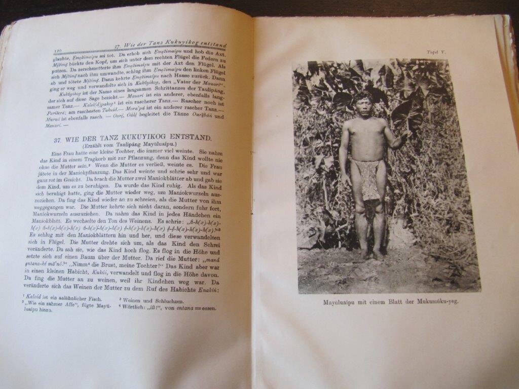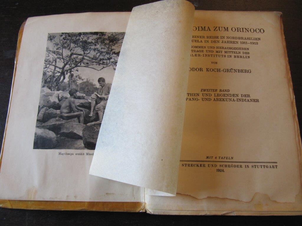 | Koch-Grünberg, Theodor. Vom Roroima zum Orinoco. Ergebnisse einer Reise in Nordbrasilien und Venezuela in den Jahren 1911-1913. Band II – Mythen und Legenden der Taulipang- und Arekuna-Indianer; mit Frontispiez und weiteren 5 Tafeln (Fotos u. Zeichnungen). Stuttgart, Strecker&Schröder, 1924. Band 2 wie meist in der 2. Auflage von 1924. XI, 313 S. 4°. Original-Papier-Einband, unbeschnitten. Der Band hatte einen Wasserschaden und ist durchgängig leicht gewellt, ausserdem im vorderen Teil mit leicht sichtbarem Feuchtigkeitsrand ca. 1cm von oben und unten. Der Papiereinband wurde mit Klarsichtfolie überzogen. Äußerlich in beklagenswertem Zustand ist das Buch doch im Inneren sauber und vollständig, kein Bibl.-Expl. Sonderpreis auf Grund des Wasserschadens. Theodor Koch-Grünberg (1872-1924) war einer der bedeutendsten deutschen Ethnologen und Anthropologen, der sein Lebenswerk fast ausschließlich den Indianervölkern Brasiliens und Venezuelas widmete. Er war auch ein Pionier der anthropologischen Fotografie, viele seiner Werke waren diesbezgl. hervorragend ausgestattet. Bestellnummer: kai2336 Preis: 60 EUR Versandkonditionen |